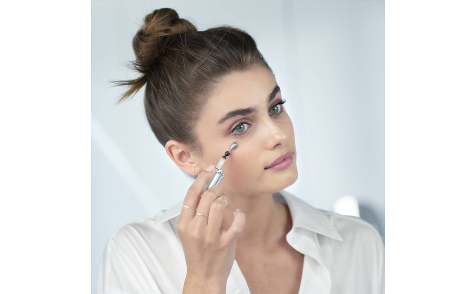 L'applicatore innovativo flessibile a 360° in acciaio inox aiuta a ridurre i segni del tempo intorno agli occhi e rinfresca immediatamente la pelle, abbassandone la temperatura di -3°C* dopo appena un minuto dall'applicazione.
