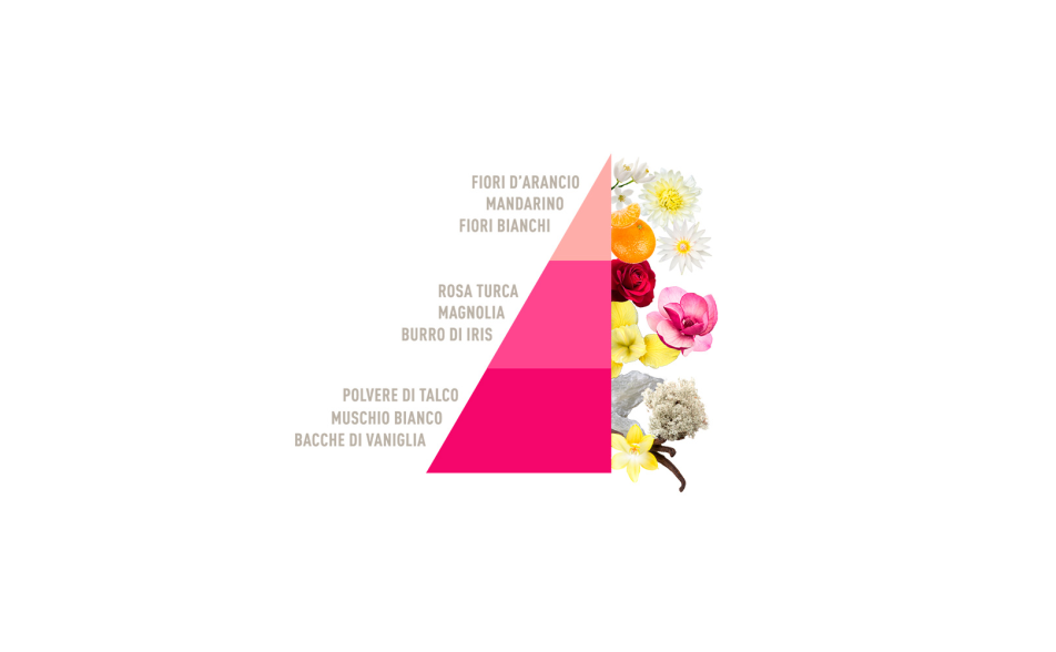Note OlfattiveDi Testa: Fiori d'arancio, Mandarino, Fiori BianchiDi Cuore: Rosa Turca, Magnolia, Burro di IrisDi Fondo: Polvere di Talco, Muschio Bianco, Bacche di Vaniglia.