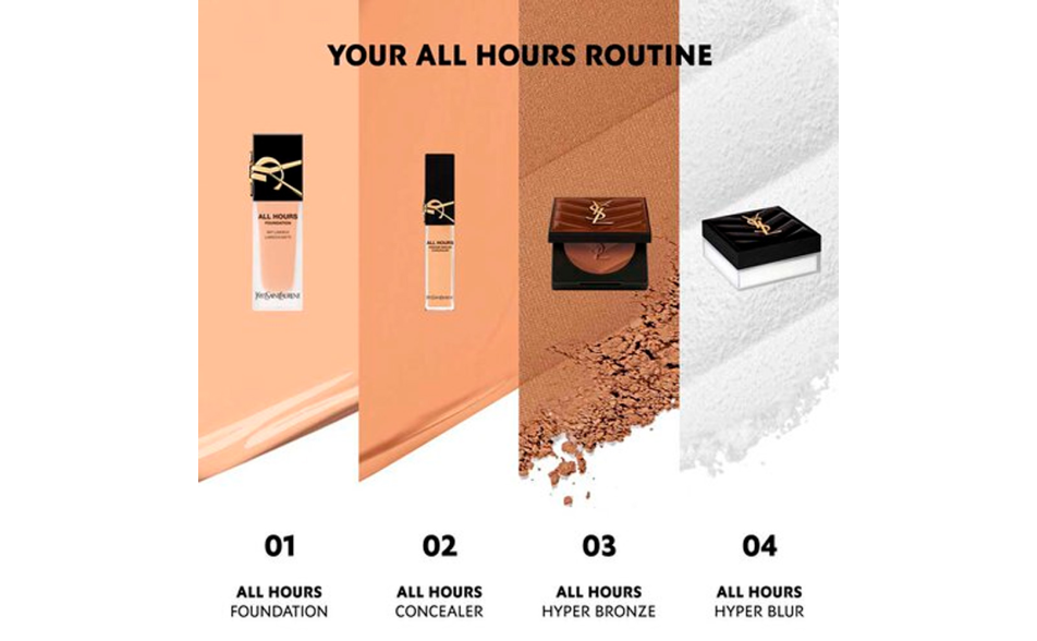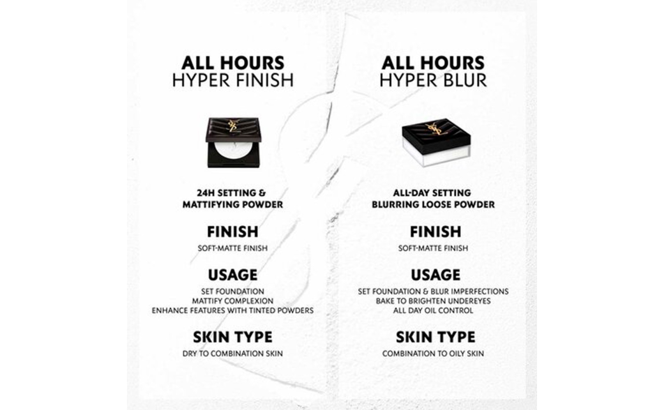 All Hours Hyper Blur è la nuova cipria couture in polvere libera che fissa, perfeziona e sfuma il trucco per tutto il giorno. Opacizza all’istante e controlla l’effetto lucido fino a 14 ore, assicurando un make-up a lunga tenuta con un finish soft matte*.