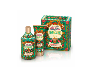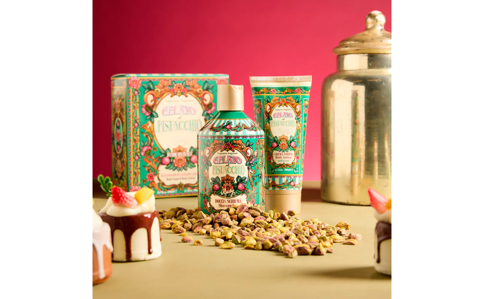 - Doccia Schiuma : deterge delicatamente avvolgendo la pelle con note golose di pistacchio salato e mandorla dolce. Un momento di piacere quotidiano sotto la doccia.