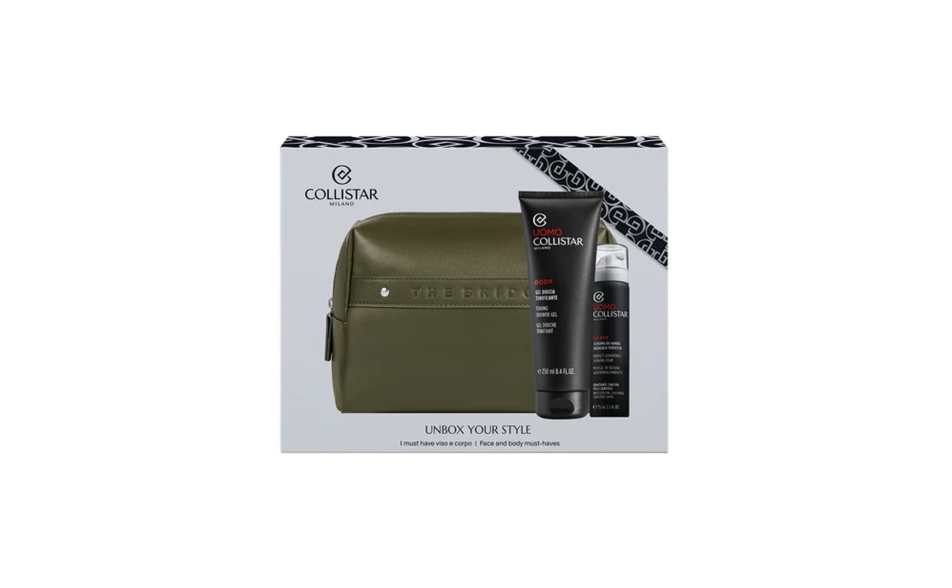 Cofanetto Collistar Uomo con Gel Doccia Tonificante 250 ml, Schiuma da Barba Aderenza Perfetta 75 ml e Pochette THE BRIDGE. Un set ideale come idea regalo uomo, perfetto per la routine quotidiana di doccia e rasatura.