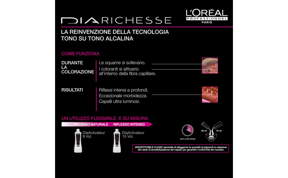 Diarichesse illumina il colore naturale dei capelli grazie al sistema di colorazione tono su tono, per un risultato ultra-trendy con un finish lucido e brillante e un tocco soft.