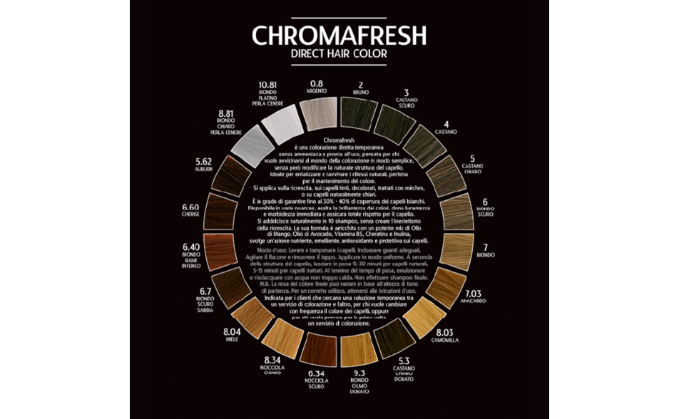 Chromafresh è una colorazione diretta temporanea senza ammoniaca e pronta all'uso.