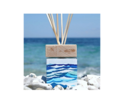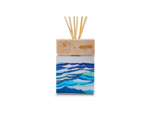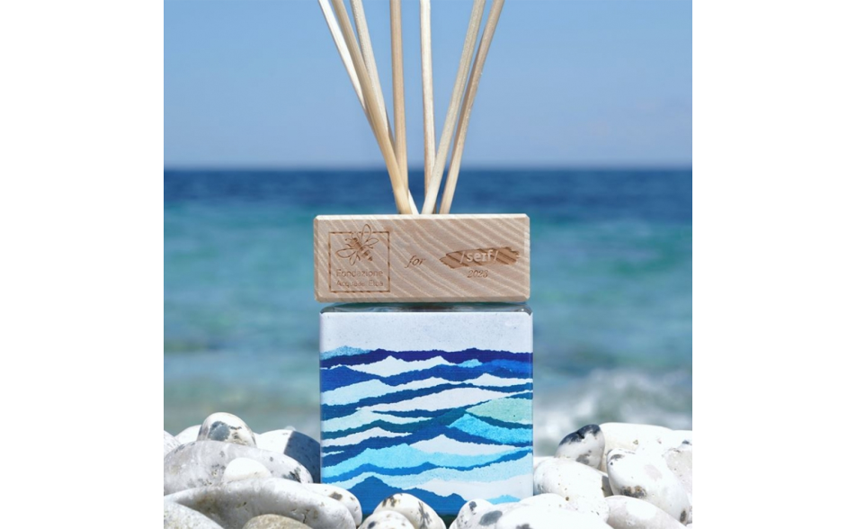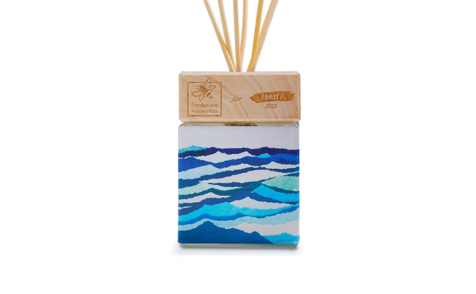 Quest'anno, per condividere le finalità del progetto, Acqua dell'Elba ha personalizzato l'iconico profumatore "Mare" arricchendolo con una riproduzione serigrafata di una delle opere dei collages in carta vetrata della serie "Mediterraneo" di Cristina Sammarco.