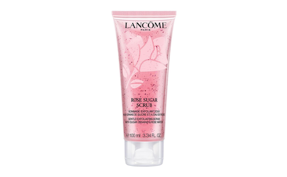 Lo scrub esfoliante descritto è delicato e arricchito con granelli di zucchero e acqua alla rosa.