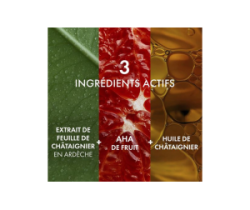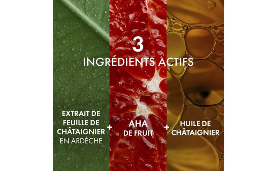 - Estratto di Foglie di Castagno: Raccolto a mano nell'Ardèche, questo estratto lenisce la pelle e rafforza la funzione di barriera cutanea, promuovendo un'idratazione profonda.