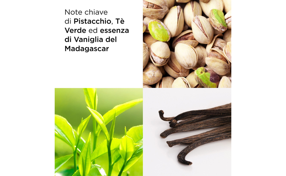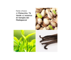 - Note di pistacchio, tè verde, miele, olio di bergamotto italiano, magnolia, eliotropio, assoluta di baccello di vaniglia del Madagascar e ambra bianca