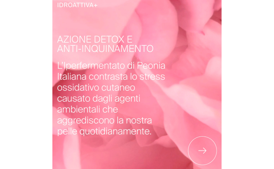 Inoltre, l'IPERFERMENTATO DI PEONIA ITALIANA, ora due volte più efficace, offre un'azione anti-inquinamento e anti-ossidante detox.