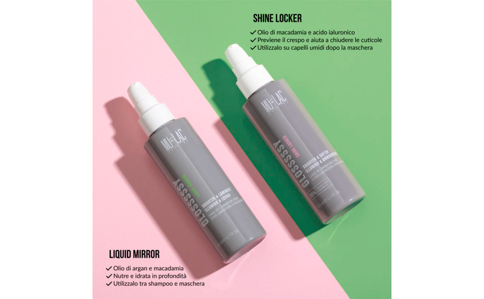 Fluido laminante leggero formulato per levigare la fibra capillare, prevenire il crespo e donare una lucentezza a specchio effetto “glass hair” fino al lavaggio successivo.