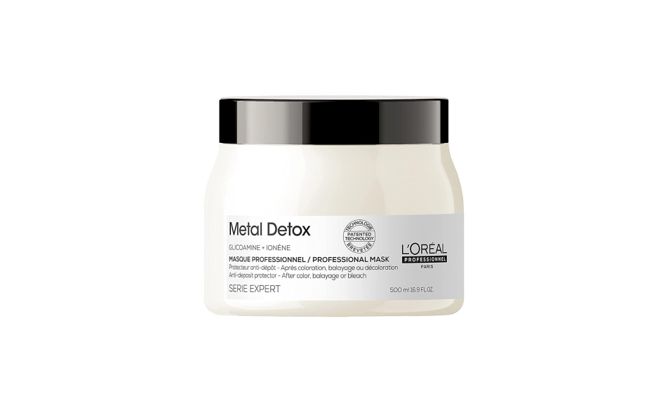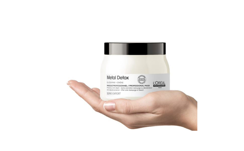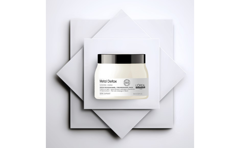 La maschera protettiva anti-deposito Metal Detox protegge la fibra capillare dai depositi di particelle di metallo dopo qualsiasi servizio di colorazione, balayage o schiaritura.