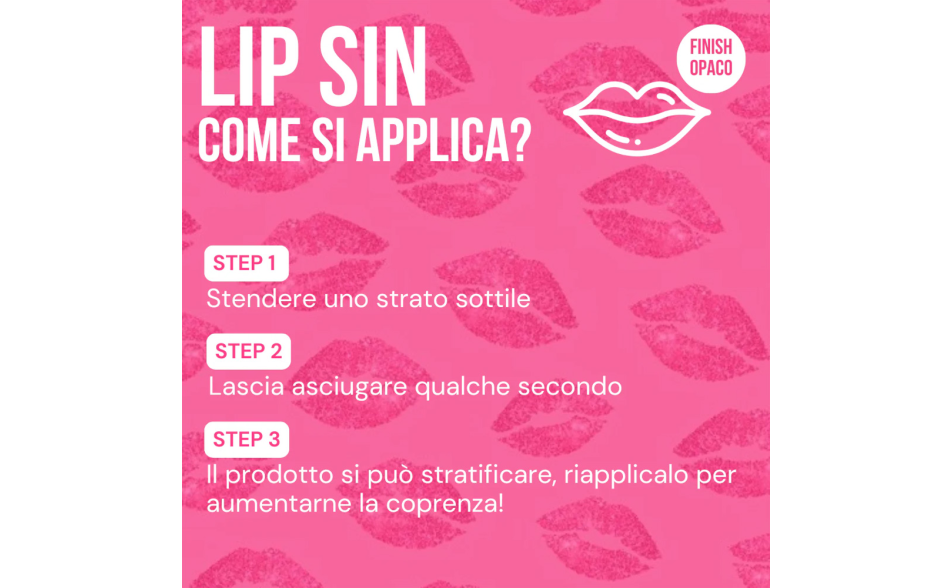 Per una maggiore precisione, contorna le labbra utilizzando LIP MASTER prima di applicare LIP SIN. Assicurati di agitare il prodotto prima dell'uso e stendere un solo strato per ottenere un finish uniforme.