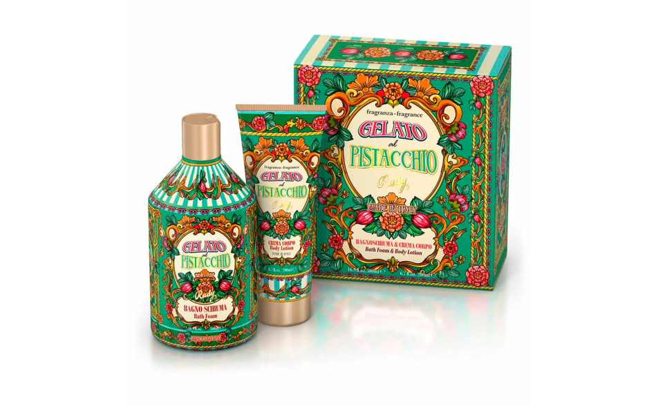 - Doccia Schiuma : deterge delicatamente avvolgendo la pelle con note golose di pistacchio salato e mandorla dolce. Un momento di piacere quotidiano sotto la doccia.