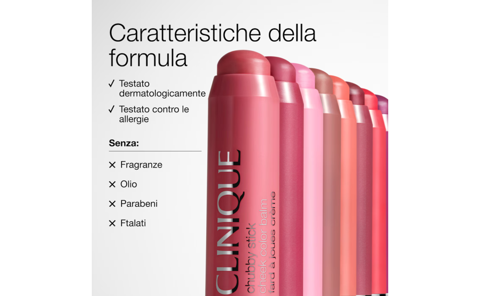 Il Chubby Stick™ Blush di Clinique è un balsamo colorato per le guance dalla texture cremosa e modulabile, che dona un finish naturale e vellutato per un incarnato fresco e radioso.