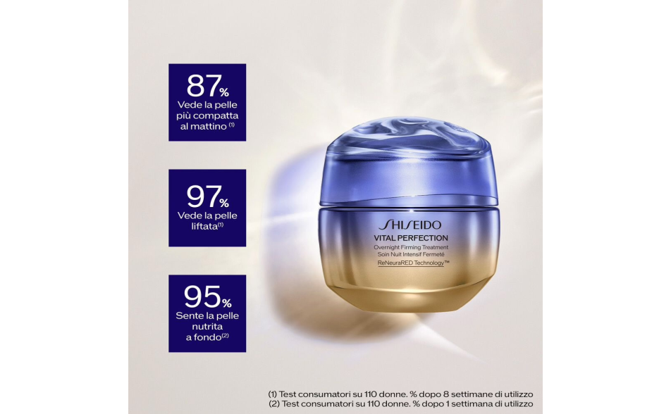 Applicare Shiseido Vital Perfection Overnight Firming Treatment ogni sera come ultimo step della routine skincare. Distribuire uniformemente sul viso e sul collo, massaggiando delicatamente fino a completo assorbimento. Utilizzare regolarmente per ottenere i migliori risultati liftanti e rassodanti.