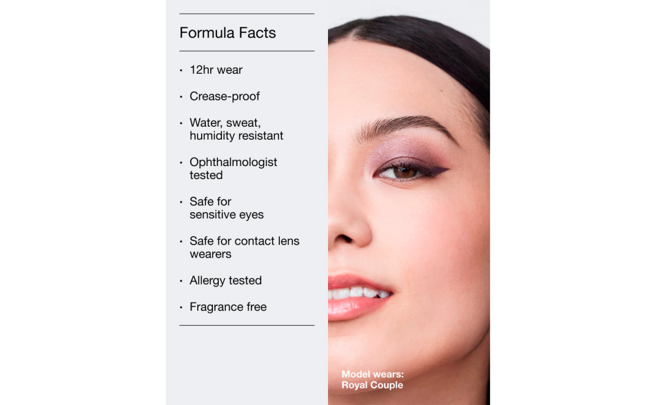 Garantisce un colore iper-pigmentato a lunga tenuta fino a 24 ore. La formula oftalmologicamente testata è resistente a sbavature, sudore e umidità.