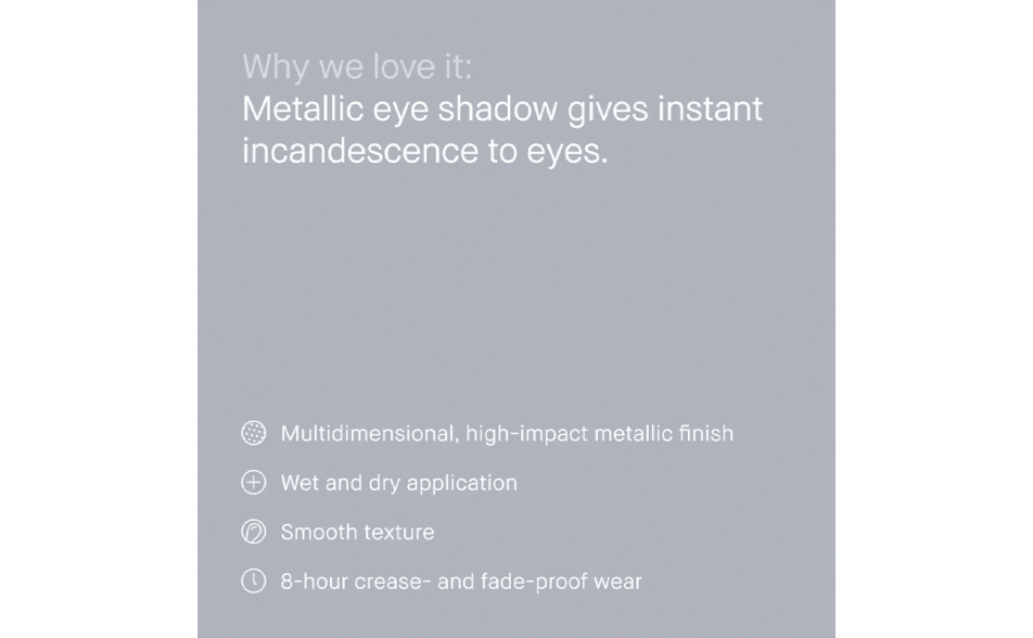 Disponibile in tre nuovi finish lussuosi - Rich Lustre, Rich Metal e Rich Sparkle - questo ombretto colato offre un effetto metallico 3D.