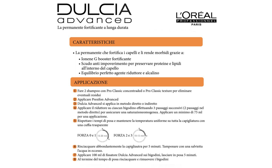Dulcia Advanced è una permanente per ricci morbidi che al contempo fortifica i capelli, li protegge e li rende soffici grazie alla presenza del Moisture Lock Complex, una combinazione di Ionène G e silicone per una morbidezza a lunga durata.
