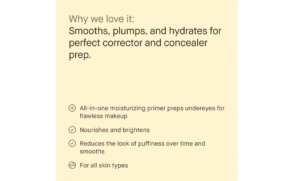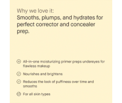 Arricchito con acido ialuronico e burro di karité, questo primer offre un'idratazione immediata che dura tutto il giorno, rafforzando la barriera delicata della pelle del contorno occhi. La formula leggera si assorbe rapidamente, preparandola perfettamente per l'applicazione del correttore. Le vitamine B3 e C illuminano la zona e riducono visibilmente l'aspetto delle occhiaie, mentre la vitamina A minimizza le linee sottili. La vitamina E fornisce benefici antiossidanti, e la caffeina aiuta a diminuire il gonfiore sotto gli occhi nel tempo.