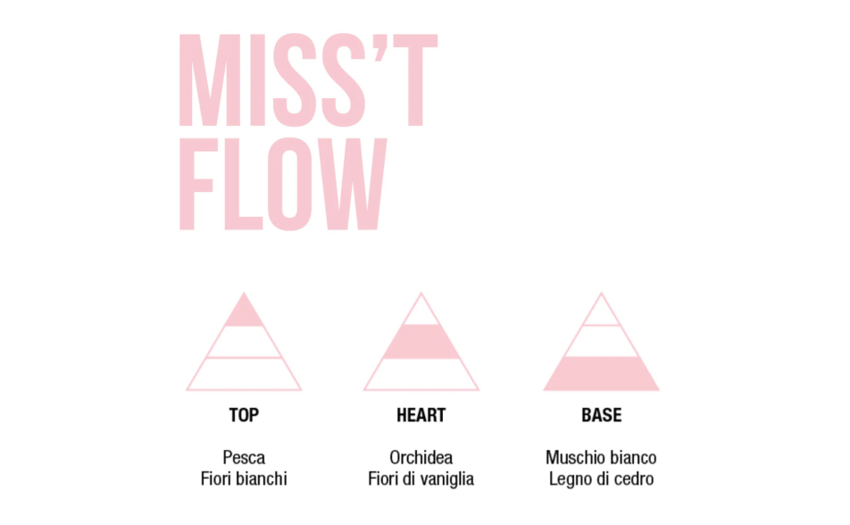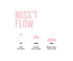 Miss't Flow offre una fragranza unica, che apre con una nota fruttata di pesca e si fonde con le sfumature eteree dei fiori bianchi, creando un'armonia fresca e avvolgente. Il cuore di orchidea e fiori di vaniglia aggiunge dolcezza e profondità, mentre il fondo di muschio bianco dona una nota delicata e persistente.