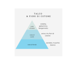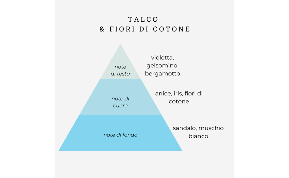 La fragranza è un abbraccio delicato e avvolgente che unisce le note pulite e cipriate del talco con la leggerezza soffice dei fiori di cotone. Una vera coccola quotidiana, perfetta in ogni stagione.