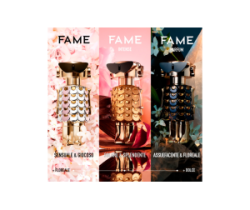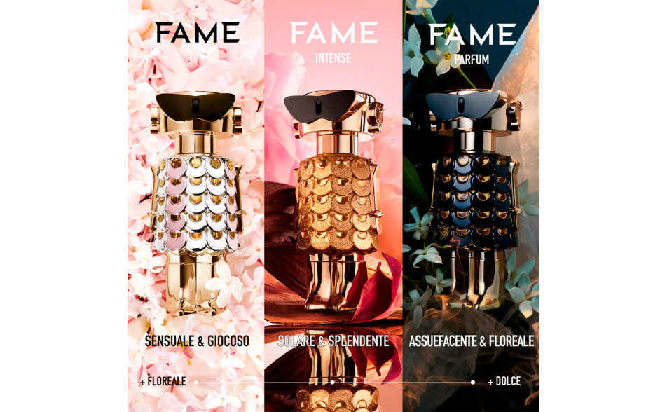 Con il suo flacone dorato dalle sfumature ambrate e dorate, FAME Intense si trasforma in un gioiello luminoso che cattura ogni sguardo, incarnando una nuova star FAME.