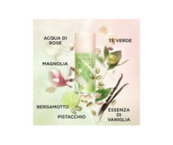 Il bergamotto italiano e il pistacchio aprono la fragranza con una nota fresca e agrumata, mentre il tè verde aggiunge un tocco frizzante. Il cuore di eliotropio arricchisce la composizione con un delicato profumo floreale. Infine, la base di vaniglia e ambra bianca regala una scia calda e avvolgente.