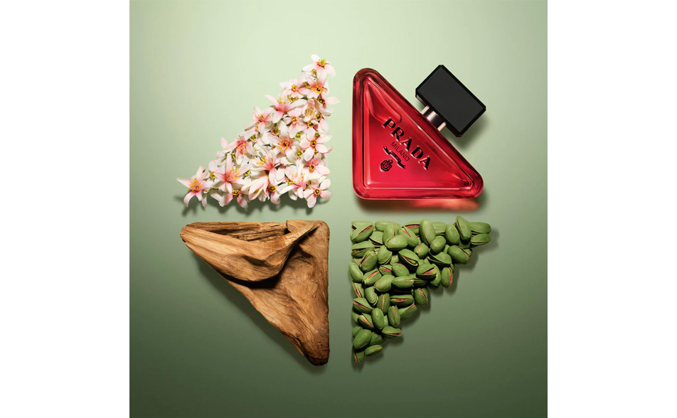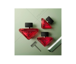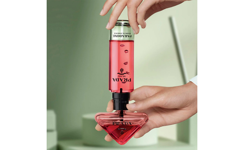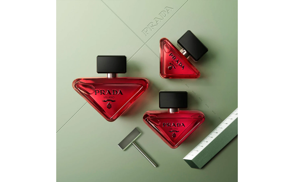 Il flacone minimalista rompe le convenzioni dell’architettura tradizionale dei profumi. Ispirato al celebre logo triangolare Prada, si adagia con audacia su un fianco. Il contrasto tra la lacca rosa intensa e il logo nero riflette l’essenza potente di Radical Essence, mentre la texture richiama l’iconica pelle Saffiano.