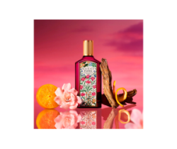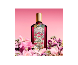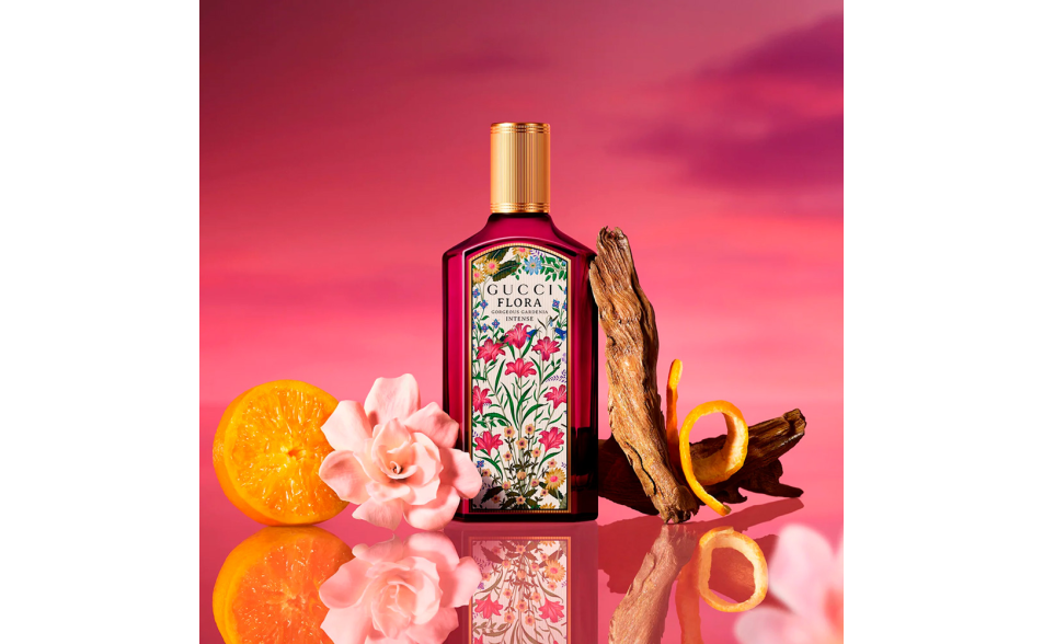 Il flacone rivisitato, vestito nel motivo Flora Gucci su sfondo fucsia, è un tributo all’eleganza senza tempo della Maison. La scritta dorata “Intense” segnala la profondità della composizione, mentre la luce solare esalta ogni angolatura, trasformando il vetro da misterioso a magnifico.