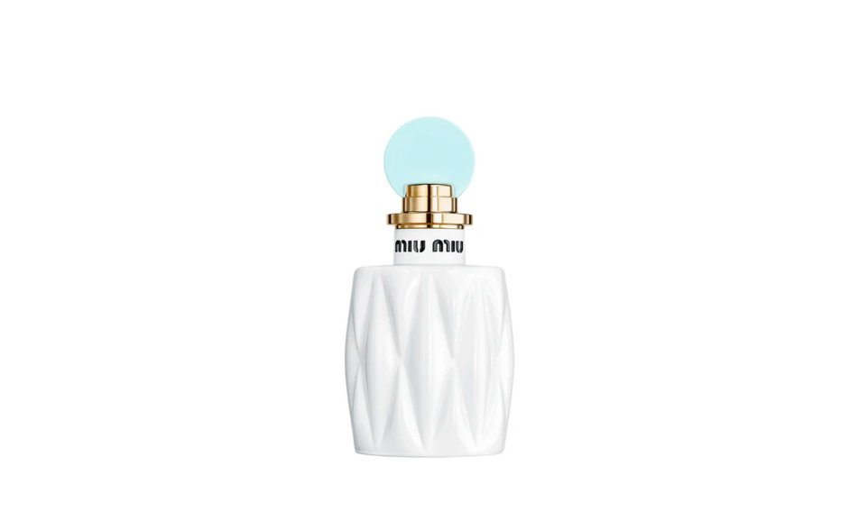 Il flacone di Miu Miu Fleur de Lait reinterpreta la texture matelassé delle iconiche borse Miu Miu. Il vetro opaco bianco latte riflette il nome della fragranza, evocando purezza e delicatezza. Un anello con etichetta Miu Miu in bianco e nero circonda il collo, mentre il tappo opaco blu azzurro a forma di paillette aggiunge un tocco moderno e raffinato.