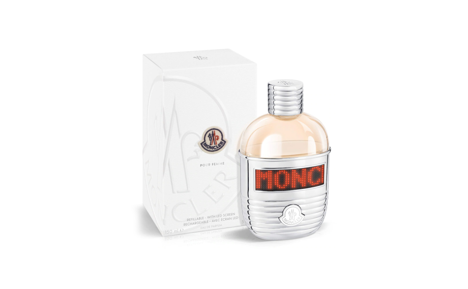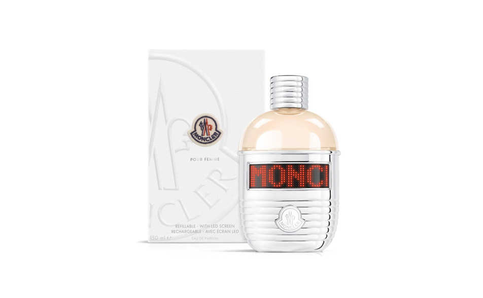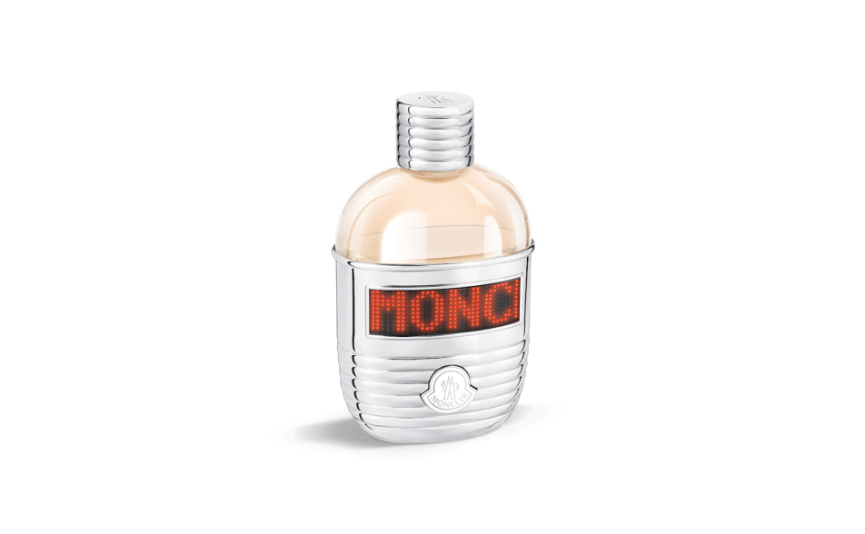 La fragranza Moncler Pour Femme è racchiusa in un flacone a forma di borraccia circondata da un rivestimento laccato in metallo e in finitura trapuntata - un richiamo alle origini "alpine" del brand e all'iconico design trapuntato dei capispalla Moncler.