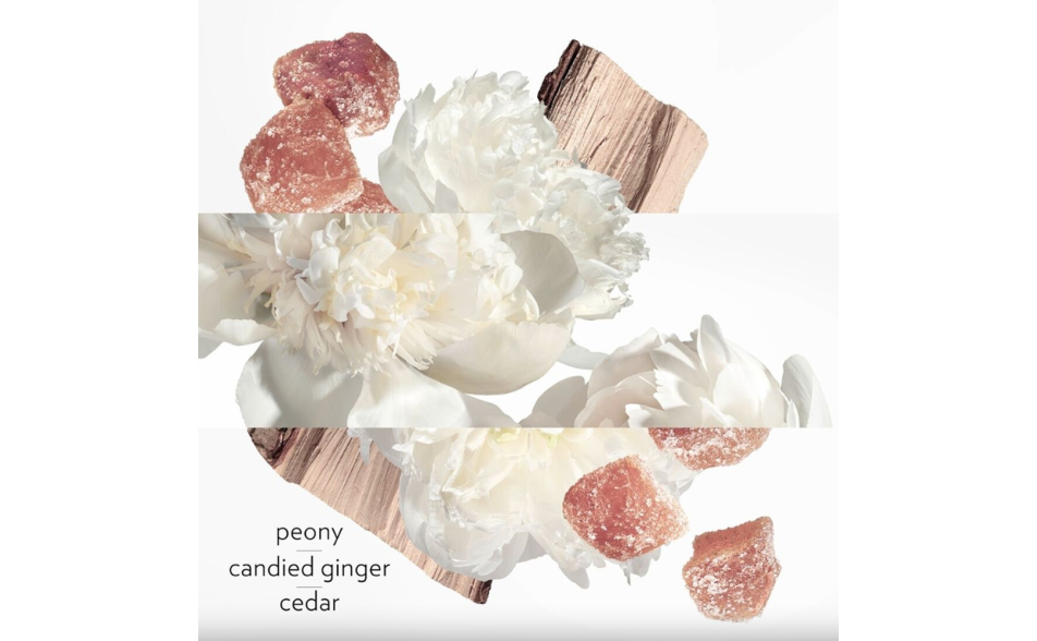 Una creazione scintillante, che nasce dall’intreccio di tre materie: una peonia generosa e vibrante, uno zenzero luminoso e candito, un cedro morbido e vivace.