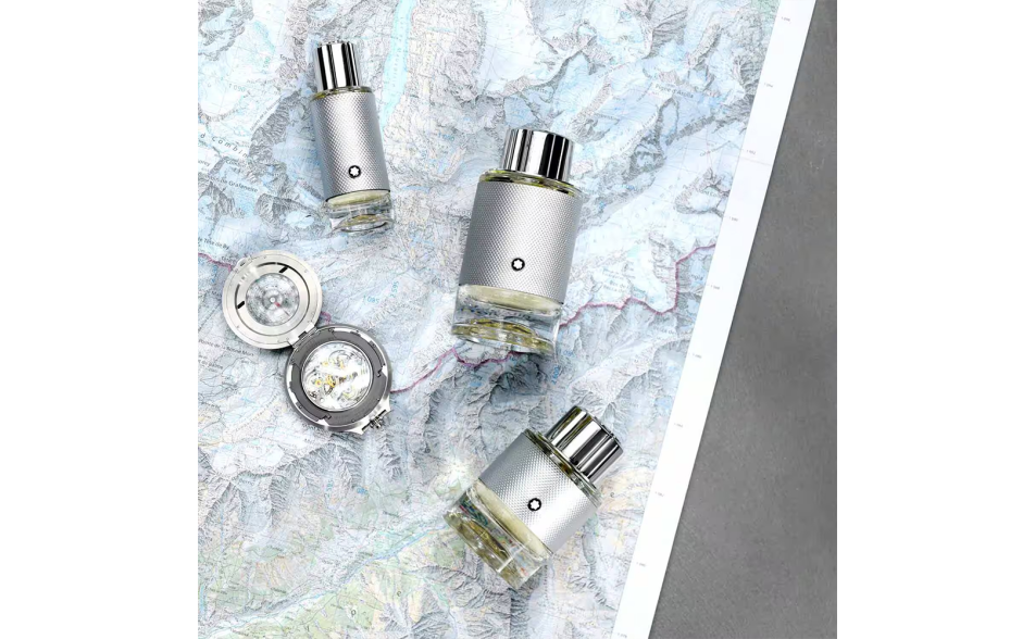 Il flacone svela un design prezioso ispirato al bracciale metallico dell'orologio Montblanc. Un omaggio alla sfida dell'alpinismo Seven Summits, l'orologio firmato Montblanc 1858 Geosphere ha ispirato la texture argentea del flacone.