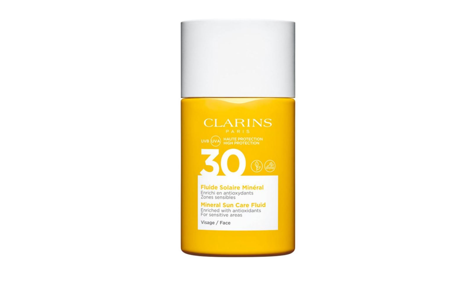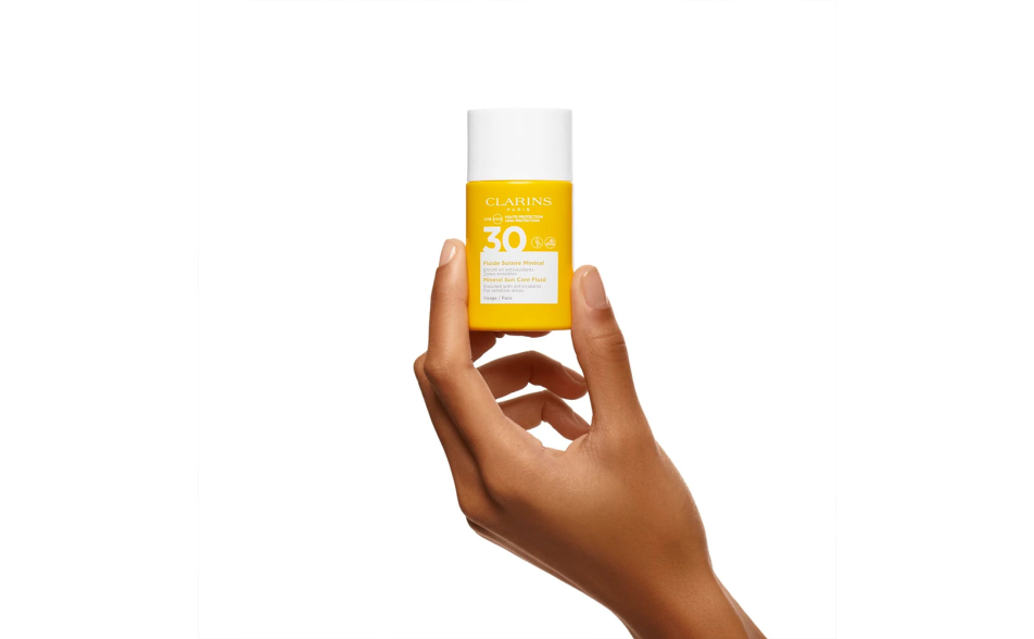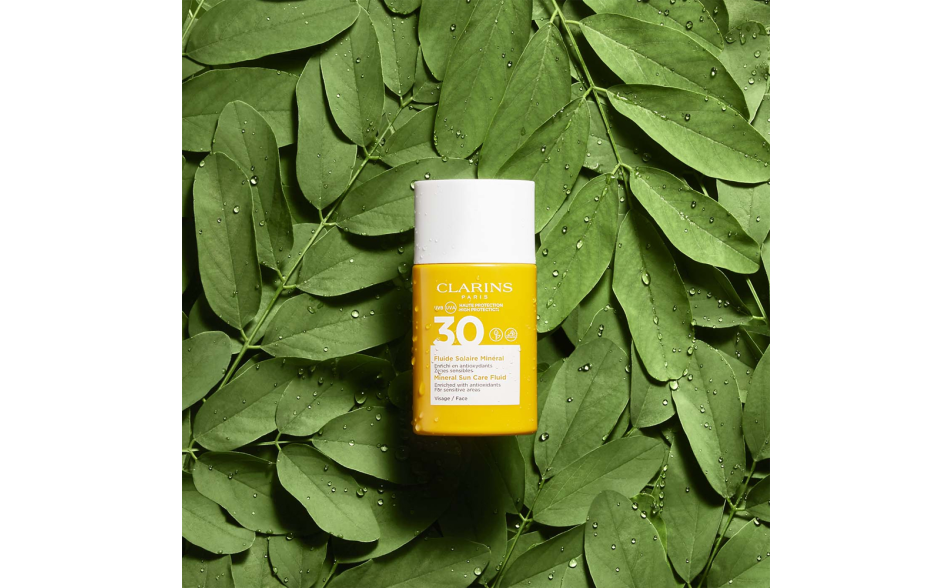 Clarins Fluido Solare Minerale Viso Spf30 è un pratico formato, ideale per questo fluido solare alta protezione antiossidante per zone sensibili o molto esposte al sole.
