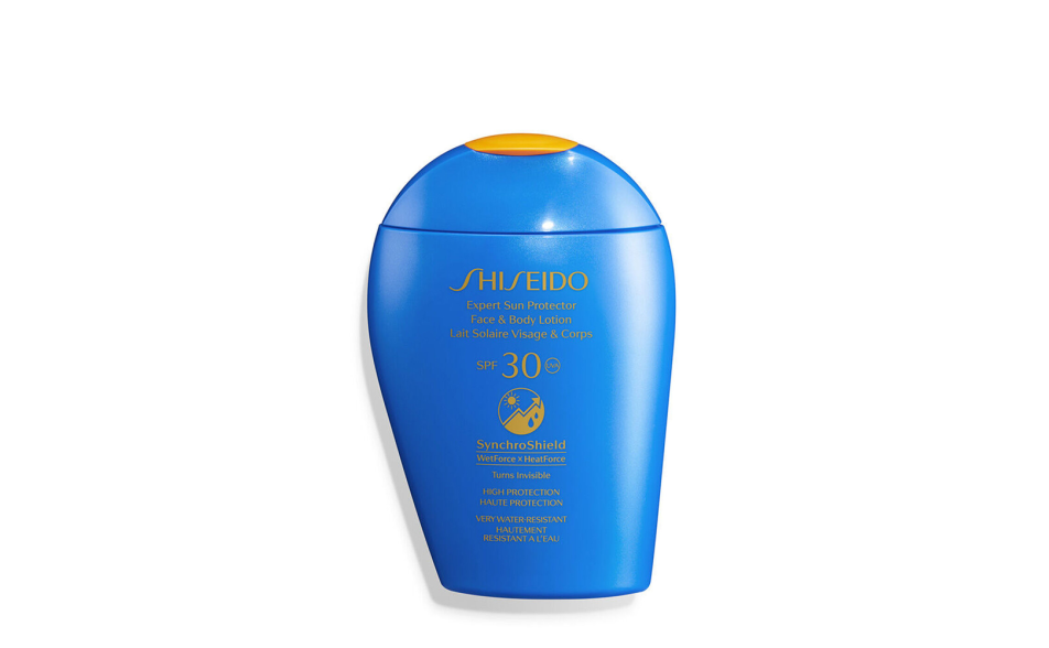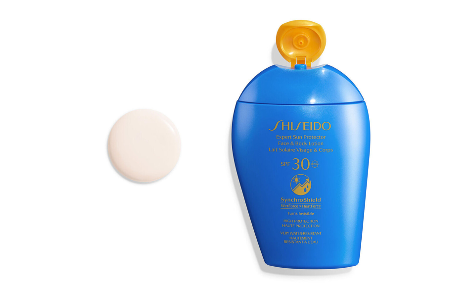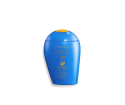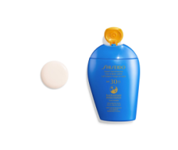 BLUE CONSCIOUS Il velo protettivo altamente resistente all'acqua del latte solare Shiseido assicura inoltre una minore dissoluzione del prodotto quando si entra in acqua rispetto agli schermi solari non waterproof.