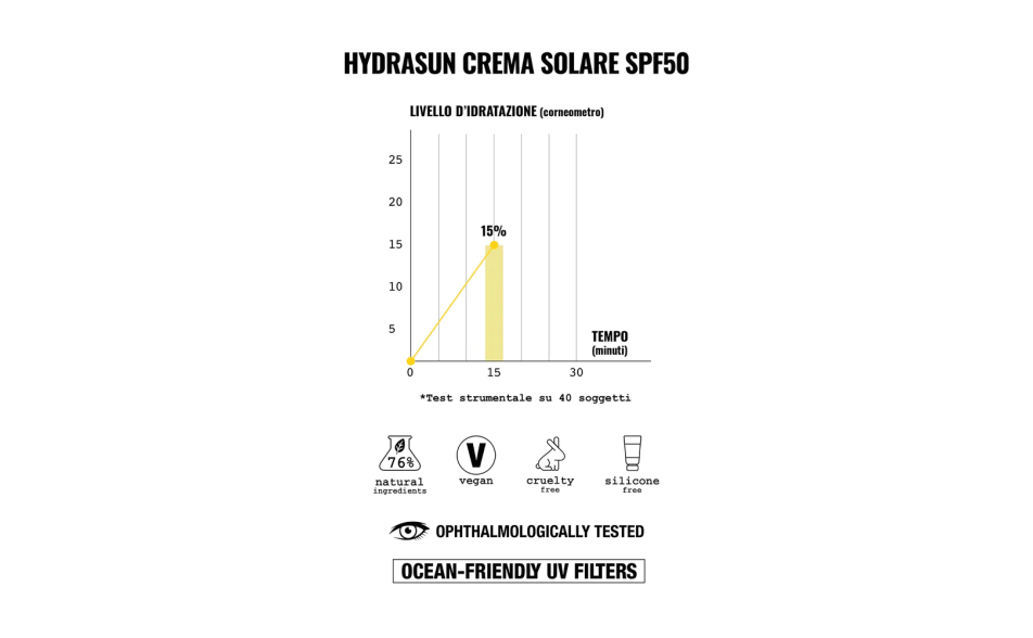 Filtri solari UVA/UVB rispettosi dell'ambiente marino, Acido Ialuronico a tre pesi molecolari, estratti di Calendula e Physalis con proprietà lenitive ed elevata tollerabilità cutanea, Vitamina E con azione antiossidante.