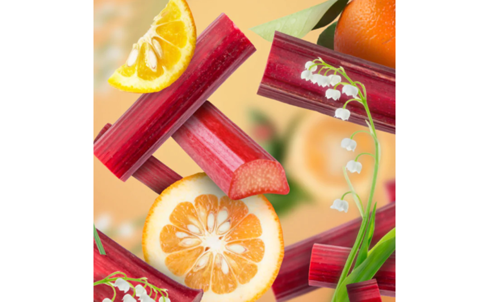 Fresco, fruttato e leggermente agrumato, questo audace profumo è succoso e frizzante. L'apertura della fragranza è caratterizzata dal fresco e fruttato rabarbaro arricchito dalle note zesty dell'amaro arancia e del bergamotto, che proseguono in un cuore floreale. Il giglio del bosco e la rosa si fondono con il gelsomino in un raffinato bouquet. Il legno di cedro e un velo di muschio creano una base morbida e vellutata.