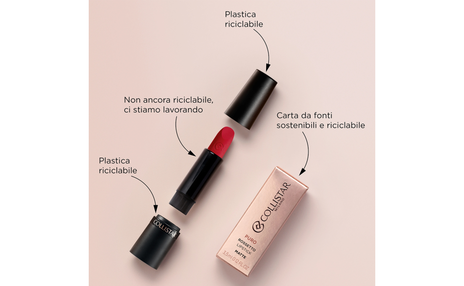 Custodito in un packaging nero ed elegante, dal finish opaco, PURO Rossetto Matte Collistar è disponibile in 9 colori contemporanei e vibranti, tra cui l’iconico Rosso Milano (111).