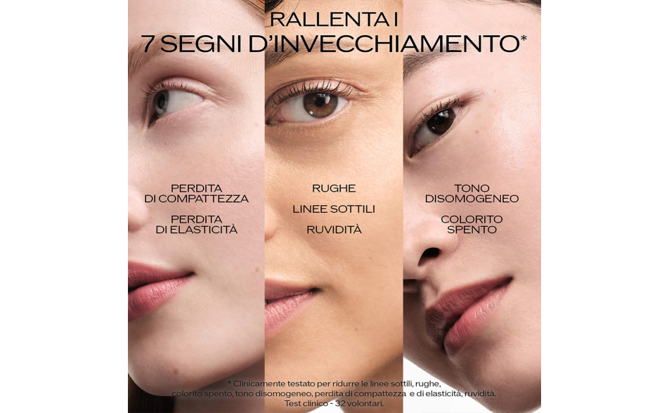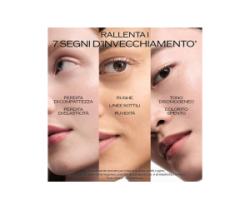 - 7 segni dell'invecchiamento ridotti: colorito spento, ruvidità, linee sottili, tono disomogeneo, rughe, perdita di compattezza ed elasticità.
