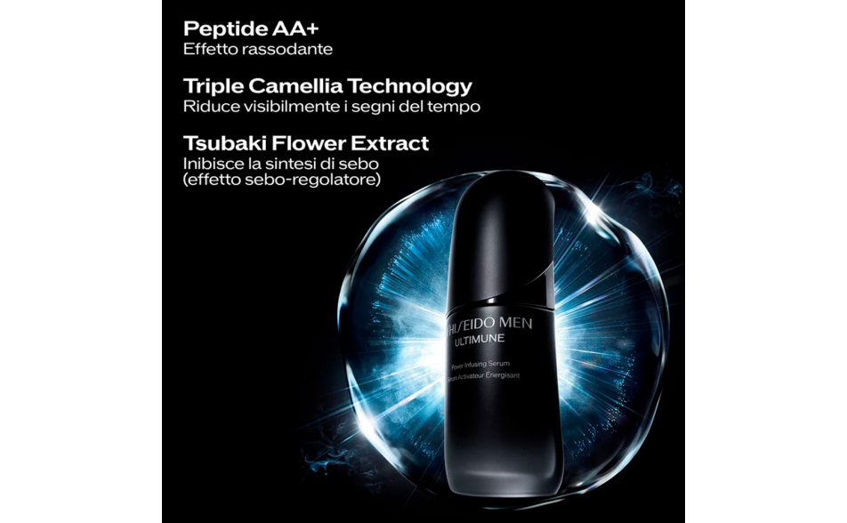 Basato su oltre 100 anni di ricerca dermatologica Shiseido sulla pelle maschile, questo siero multifunzione è un vero alleato per chi desidera una pelle visibilmente più forte, compatta e giovane. Formulato con Peptide AA+, il trattamento contrasta i principali segni dell’invecchiamento maschile: disidratazione, opacità, pori visibili, rughe, ruvidità, mancanza di compattezza e luminosità.
