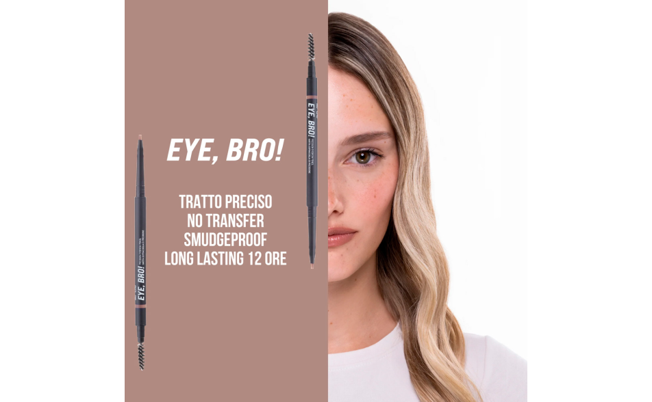EYE, BRO! è la matita automatica per sopracciglia con mina ultra-sottile pensata per ridefinire, riempire e intensificare le sopracciglia con massima precisione e un effetto naturale. La sua texture cerosa e scorrevole consente un’applicazione fluida, mentre la formula no transfer garantisce una tenuta perfetta fino a 12 ore.