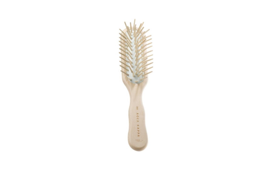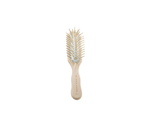 Spazzola piatta con cuscinetti in gomma naturale e spilli in legno con punta arrotondata.