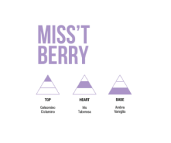 Miss't Berry si apre con note floreali di gelsomino e ciclamino, seguite da un cuore raffinato di iris e tuberosa, che aggiunge un tocco di sensualità. La fragranza si chiude con un fondo avvolgente di vaniglia e ambra, per un risultato caldo e persistente.