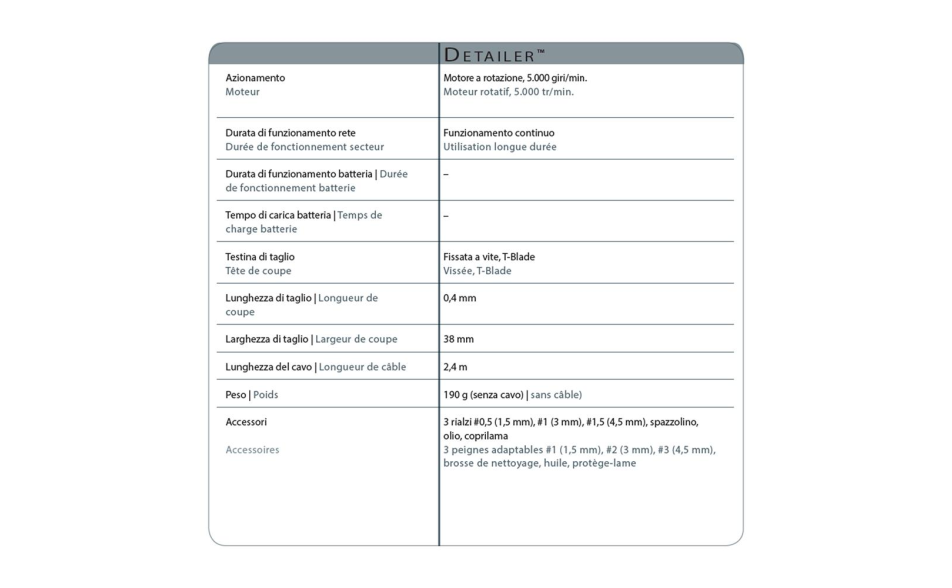 Questo è uno strumento di rasatura molto corto (0,4 mm) e adatto ai professionisti che amano perfezionare il proprio lavoro, ideale per uso continuo.
