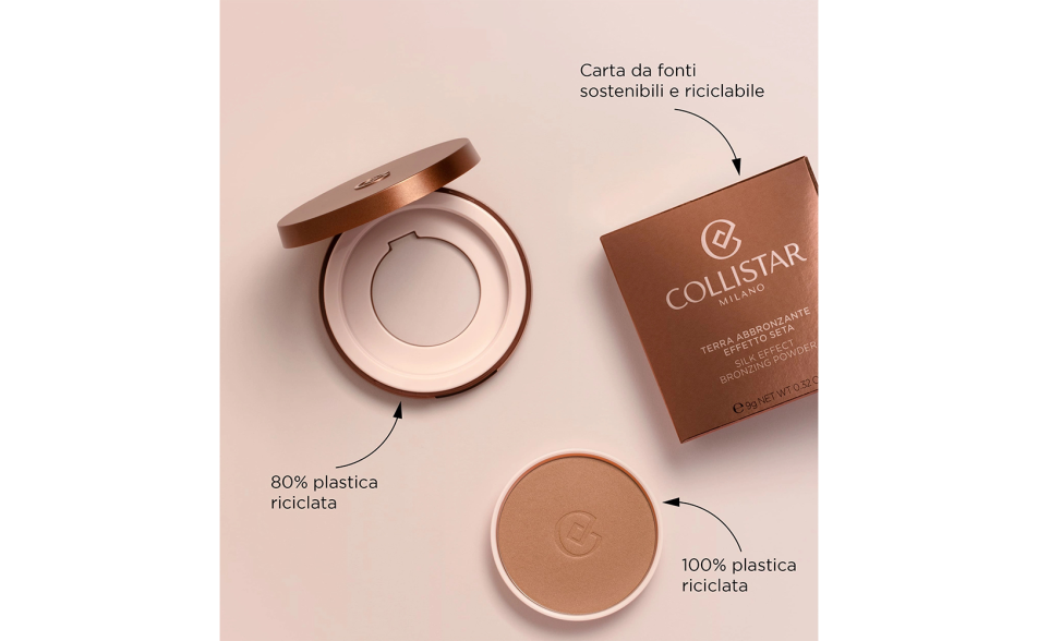 La terra abbronzante effetto seta di Collistar è sostenibile e refillable: la trousse in plastica riciclata riduce gli sprechi e promuove un acquisto responsabile. Inoltre, il talco è certificato per l'assenza di fibre di asbesto e la presenza di nichel e metalli pesanti è controllata (Nickel <0,001%).